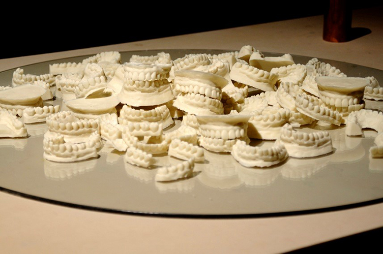 Conocemos —nos hemos cansado de escuchar y repetir— la luminosa frase de Ludwig Wittgenstein: cuando ya no es posible decir, hay que mostrar. Luis González Palma va un paso más lejos, aunque no necesariamente en dirección al mutismo que sugería también el filósofo vienés —cuando advertía que sobre lo que no es posible hablar, mejor callar—. Cuando ya no es posible mostrar —pareciera decirnos con su deriva, con la derrota que, como un navío anacrónico, dibuja su obra a través del tiempo— se trata de hacer oír.[^10] O de tocar u oler[^11] o incluso de saborear, si incluyéramos aquel proyecto en el que el artista moldea su propia mandíbula en chocolate blanco para que el coleccionista la coma[^12] o alineáramos el espléndido modo en que el artista cocina como una más de las bellas artes. Ese relevo de los sentidos —esa suerte de fotografía ampliada que predica para sí mismo— no es sino un ejercicio de problematización de su mirada.