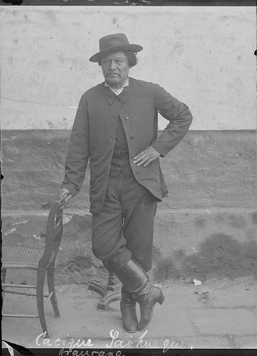 Este proceso también favoreció el desarrollo de la ciencia racial. Inacayal y Foyel, dos caciques tehuelches, y Shaihueque, un cacique manzanero, habían conocido en 1875 a Francisco Pascasio Moreno, científico y futuro fundador del Museo de La Plata (La Plata, Argentina), cuando éste recorría la Patagonia con la intención de explorar el territorio y nacionalizar a sus pobladores. De manera que, cuando diez años más tarde los tres caciques y sus familias fueron llevados a Buenos Aires, buscaron la manera de ponerse en contacto con ‘su amigo’ Pascasio Moreno para que los ayudara a resolver la situación. Shaihueque tenía más poder en su Patagonia nativa que Inacayal y Foyel, y por lo tanto pudo salir de las barracas e ir directamente a la casa de Moreno, quien “les hizo ver que esto era momentáneo y que tan pronto como llegara el Presidente se arreglaría esto de modo que ellos quedarían contentos” (Curruhuinca y Roux, 1994). Luego Shaihueque habló con el ministro de Guerra y el mismísimo Presidente de la República, y después de cinco semanas pudo regresar a la Patagonia. En cambio, Moreno tuvo que ir a visitar a Inacayal y Foyel a las barracas y lamentó públicamente las malas condiciones en que habían sido alojados. El grupo vivió casi un año como prisionero del Estado hasta que Moreno llevó a algunos a vivir a su museo.[^1] Al menos cuatro indígenas, incluyendo al cacique Inacayal, murieron allí, mientras otros regresaron a la Patagonia después de dos o tres años. Durante este período, Moreno aprovechó para estudiar a los indígenas y contrató al reconocido fotógrafo británico-argentino Samuel Boote para que los retratara. También había encargado algunas imágenes del grupo de Shaihueque antes de su partida. El resultado de estas labores ha sido 81 negativos en placas de vidrio y 12 albúminas montadas sobre placas de cartón que hoy están en el archivo fotográfico del Museo de La Plata.[^2]